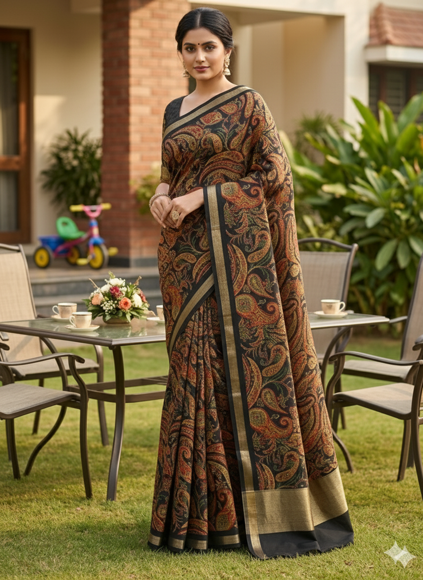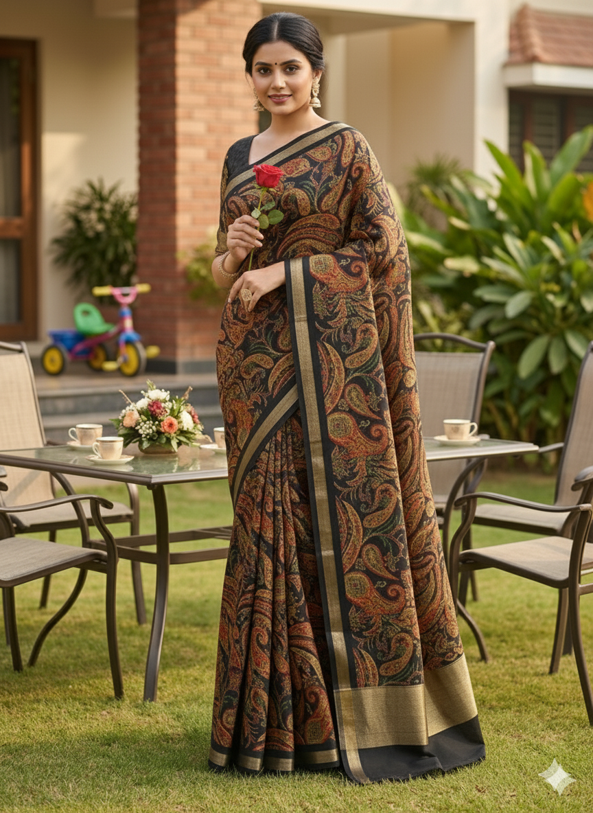 *Fabric – Pure soft Tusser kashmiri printed saree with Rich Pallu & gadwal viscose border*