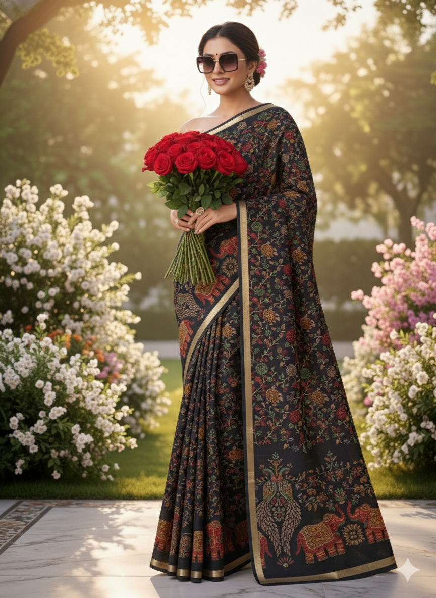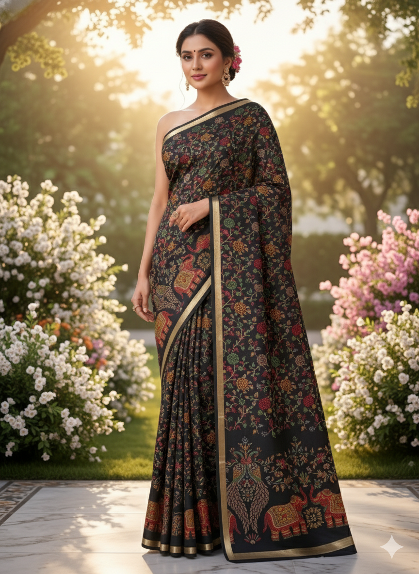 Key Features: Ultra-soft pure Tusser saree, intricate Kashmiri floral/block prints, dramatic Rich Pallu drape, elegant golden zari border, perfect for Indian skin tones.