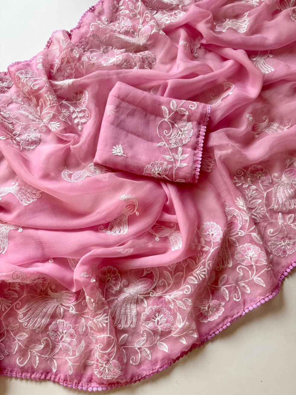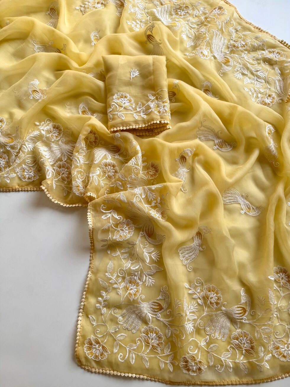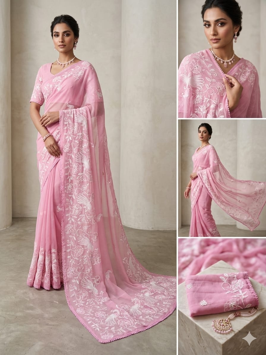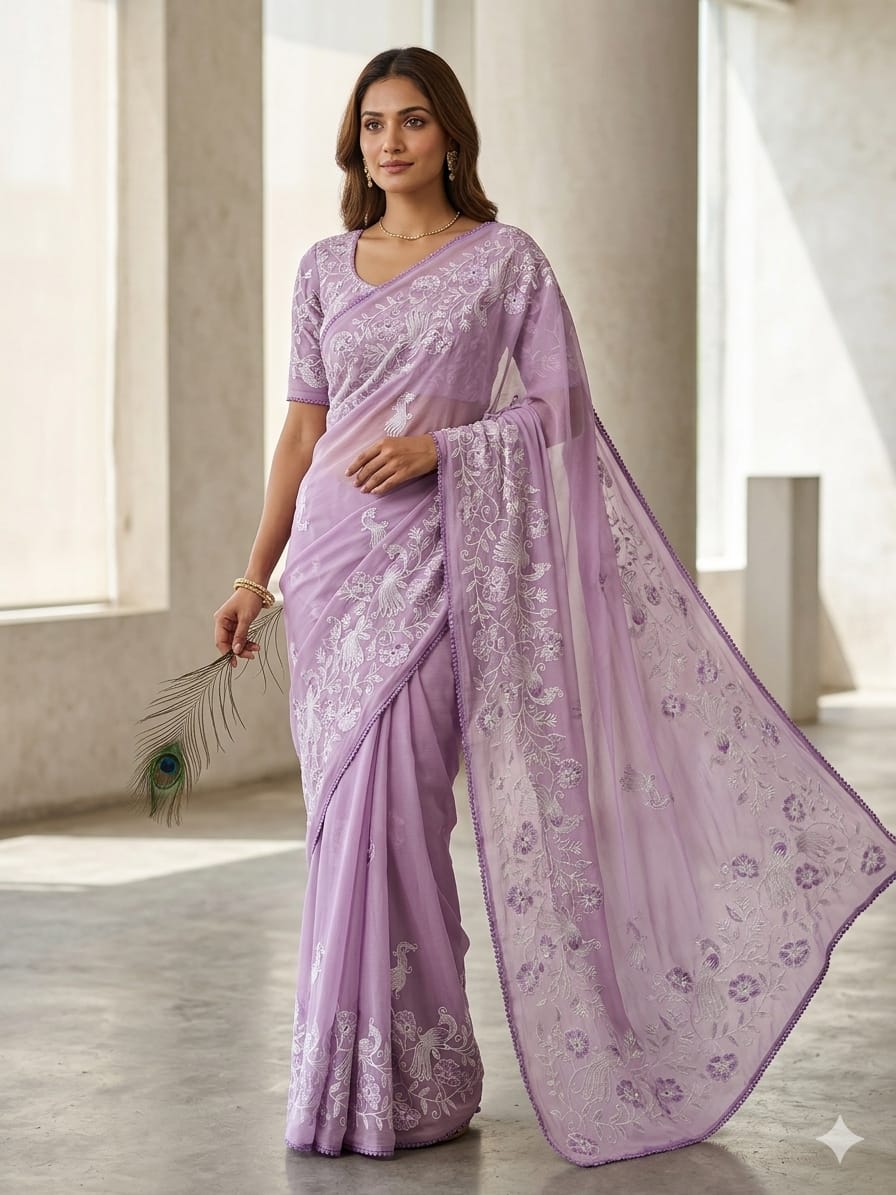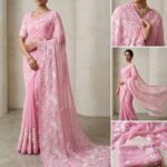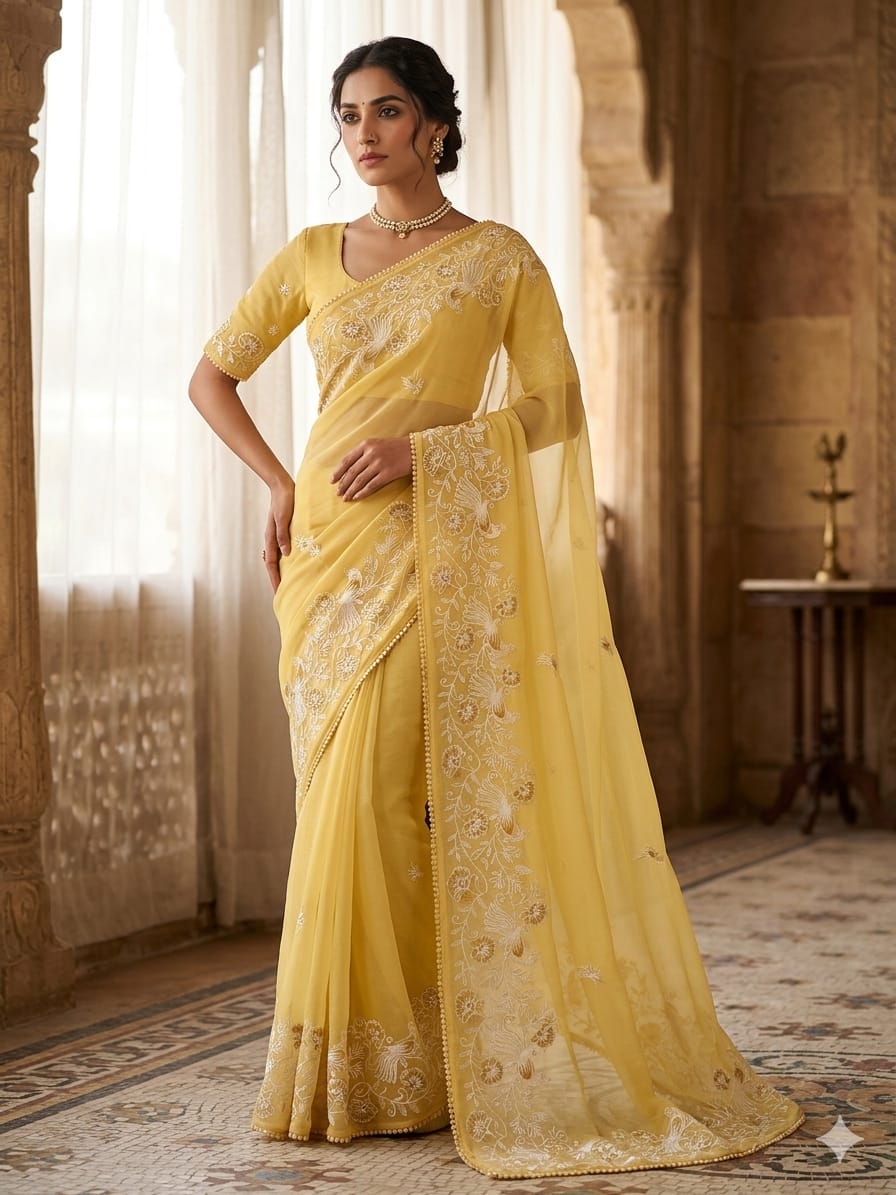 Where to Wear: Ideal for pooja saree, festive family gatherings, kitty party saree, temple visits, or semi-formal events. Its flowing drape shines at weddings (guest look) or evening sangeet.