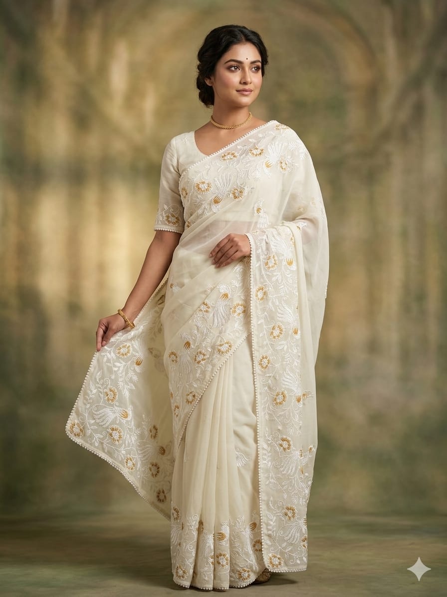 Styling Guide: Elevated with oxidized silver jhumkas, gold bangles, statement bindi, and mojris. Add a potli bag and fresh flowers minimal accessories let Kashmiri prints pop. Saree styling tip: Half-drape for modern parties, traditional pleats for poojas.