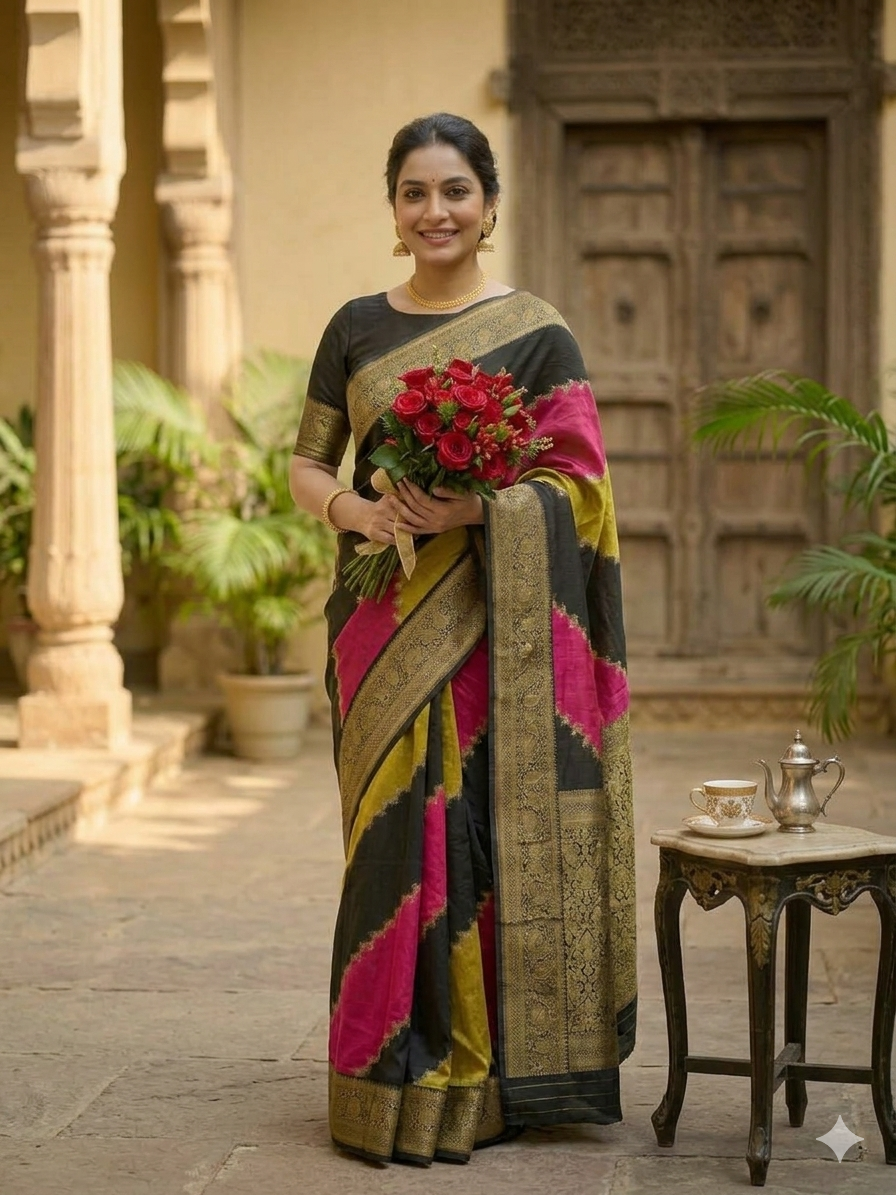 Key Features: Lightweight Banarasi Georgette saree, breathable all-over zari work, Lahariya tie-dye inspired glitter pattern, intricate weaving zari border, luxurious printed pallu, matching contrast running blouse perfect festive proportions.
