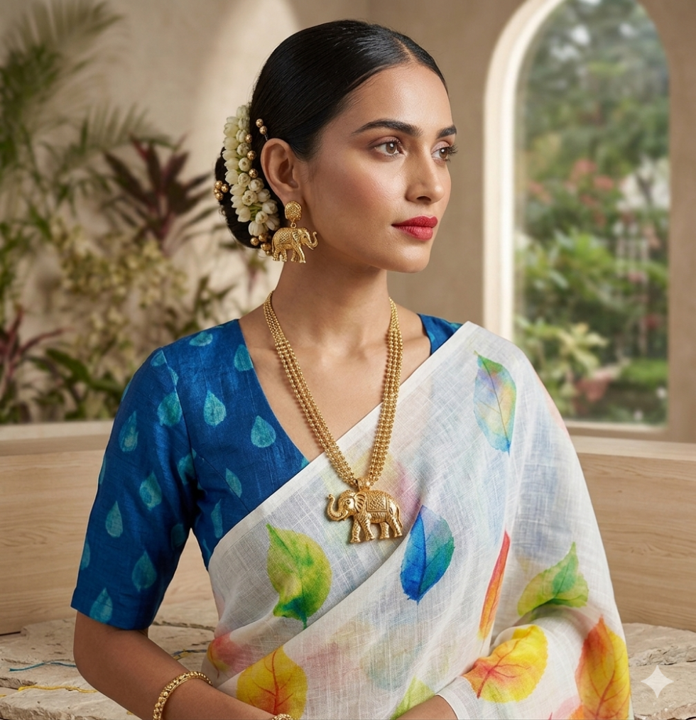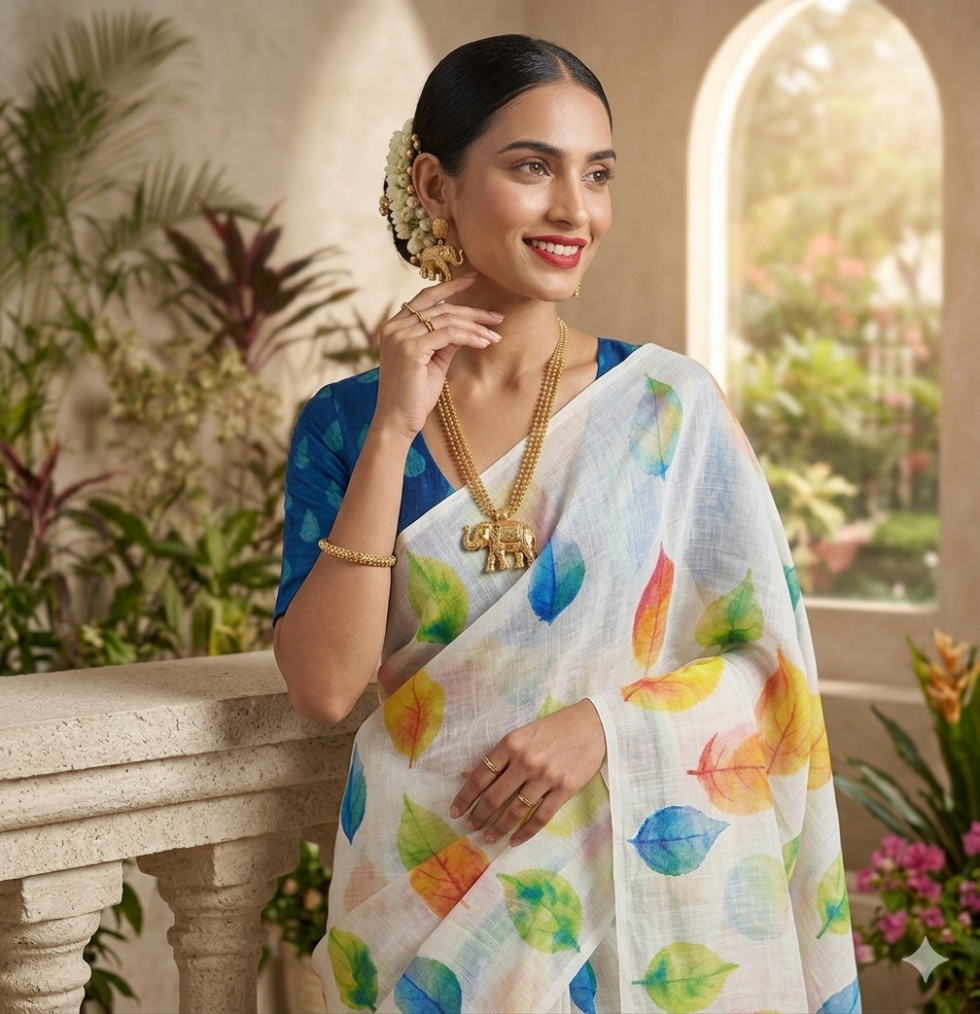 Shop Leaf Linen Soft Linen Saree with Multicolour Floral Prints, designed for women who love lightweight comfort with vibrant style. This saree features soft linen fabric that is smooth, breathable, and easy to drape, making it perfect for daily wear.