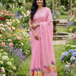 Brighten your casual wardrobe with Pink Padmini, RANISHA’s charming pink cotton linen saree crafted from soft heavy linen cotton blend with vibrant digital prints, exquisite Aari mirror work and cut work border, paired with Lilan printed blouse featuring matching aari mirror work. Ready stock at just βΉ599 (single piece) premium comfort for daily indulgence.