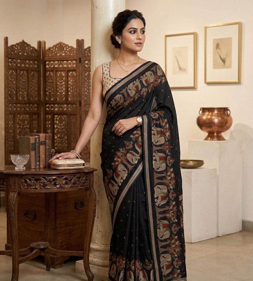 Styling Guide: Elevated with oxidized silver jhumkas, gold bangles, statement bindi, and mojris. Add a potli bag and fresh flowers minimal accessories let Kashmiri prints pop. Saree styling tip: Half-drape for modern parties, traditional pleats for poojas.