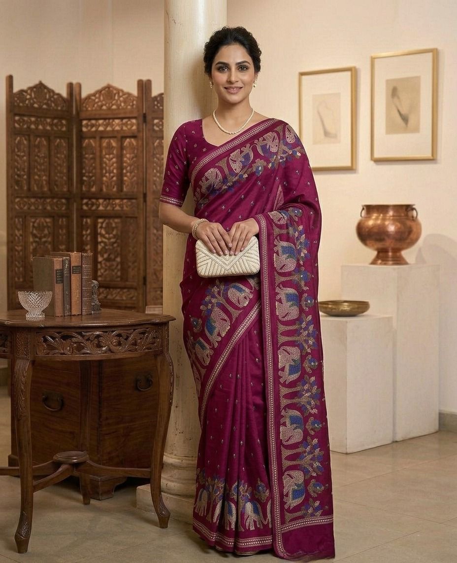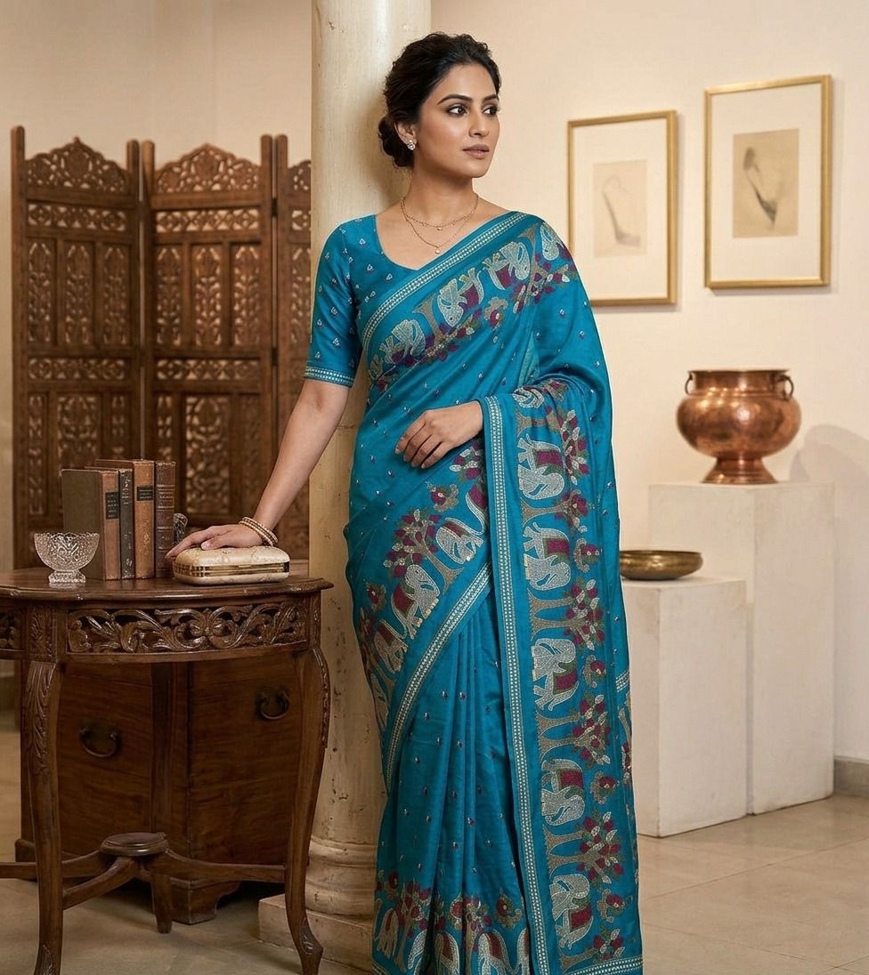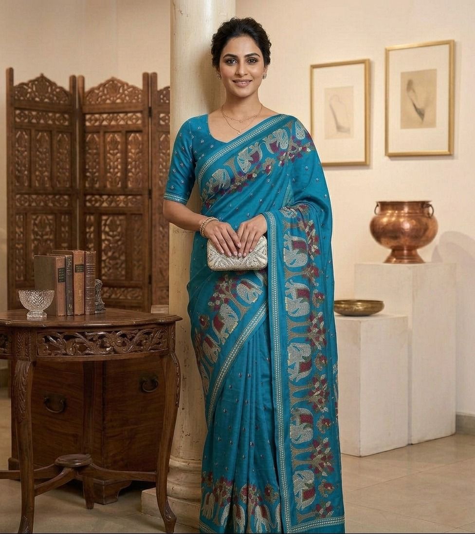Where to Wear: Ideal for pooja saree, festive family gatherings, kitty party saree, temple visits, or semi-formal events. Its flowing drape shines at weddings (guest look) or evening sangeet.