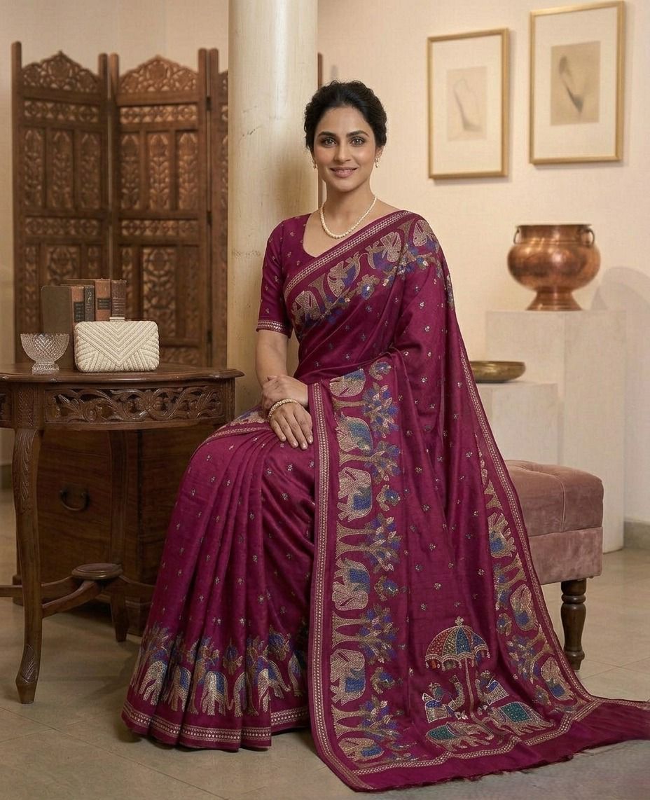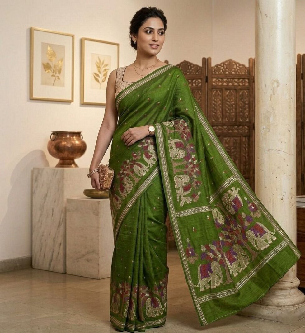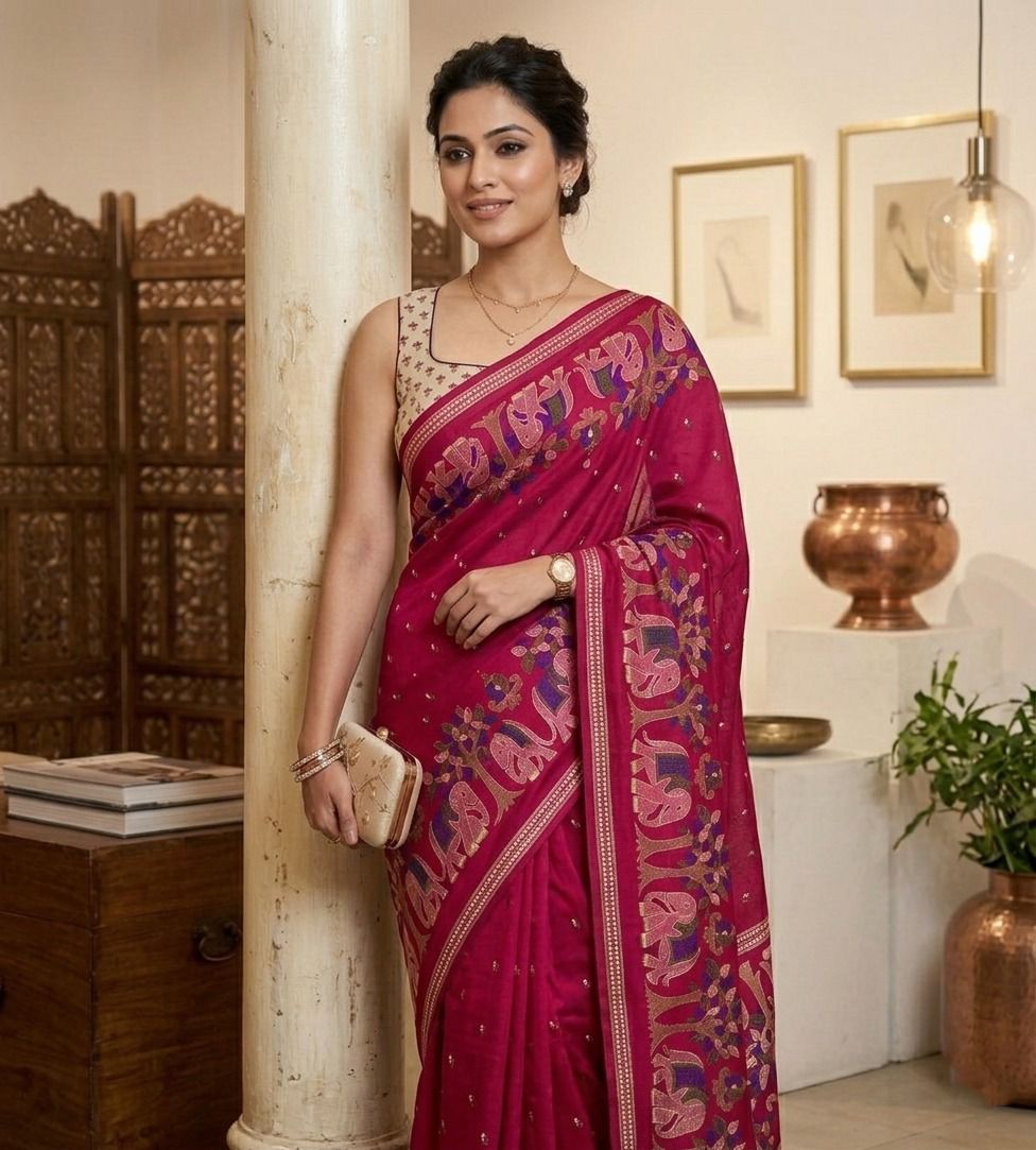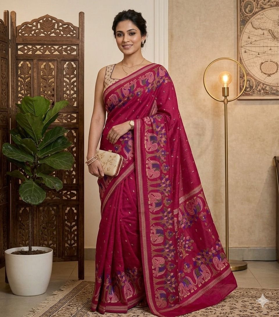 Key Features: Lightweight pure Tusser saree, vibrant Kashmiri prints that hold color wash after wash, Gadwal-style viscose border for traditional charm, and breathable comfort for Indian summers.