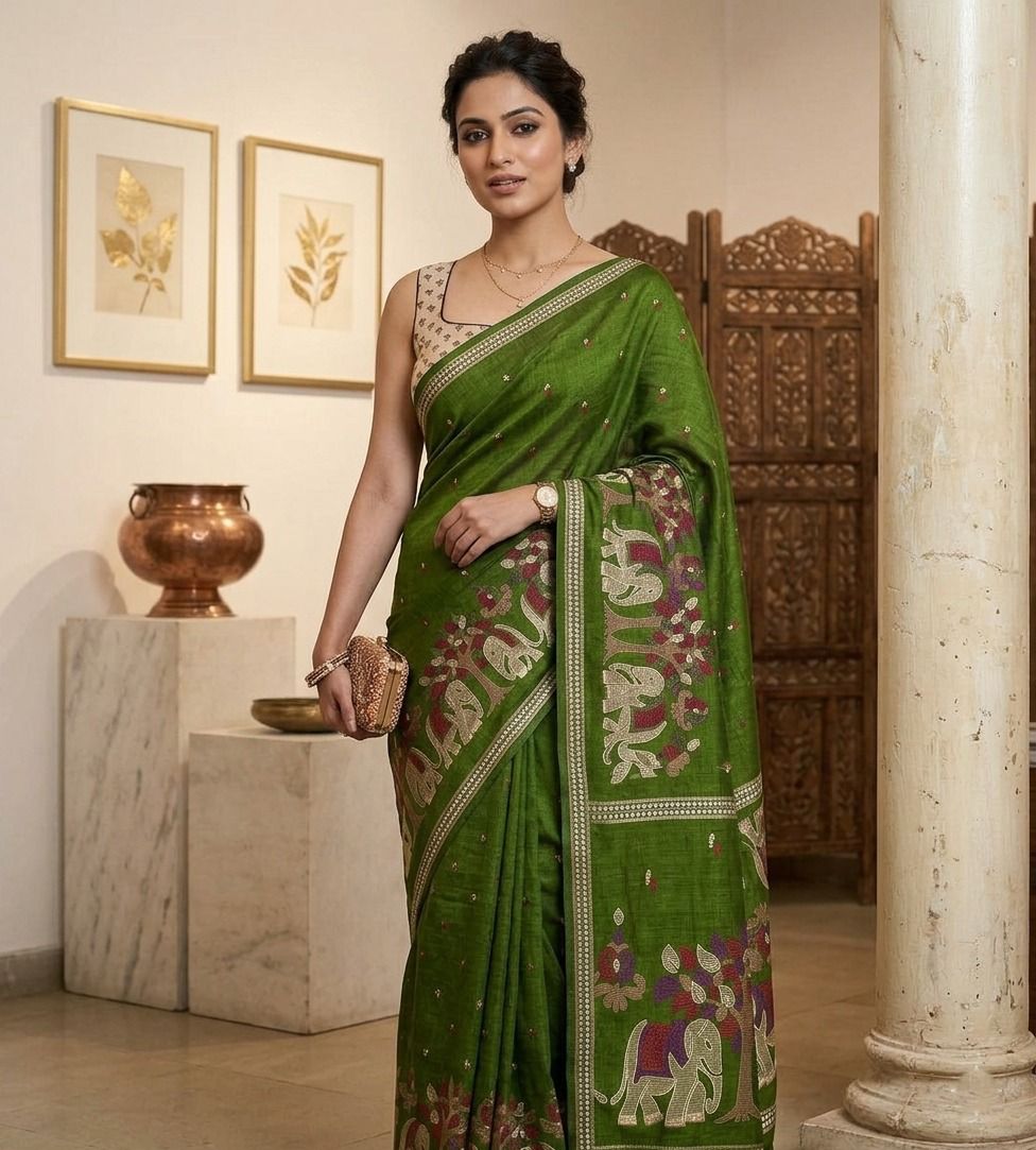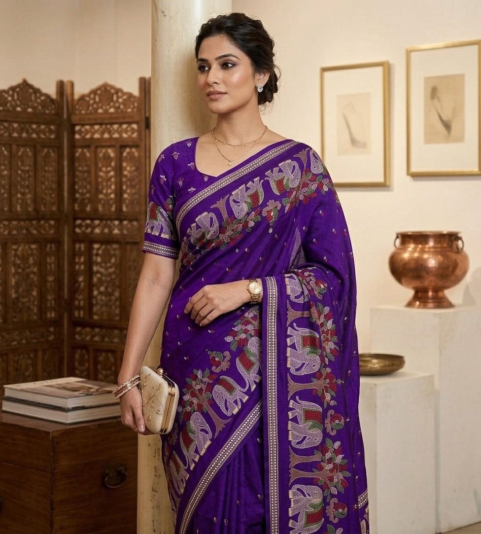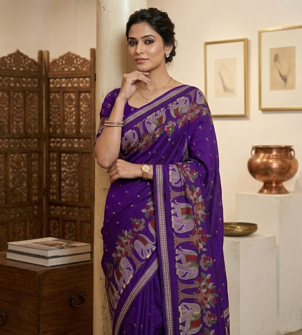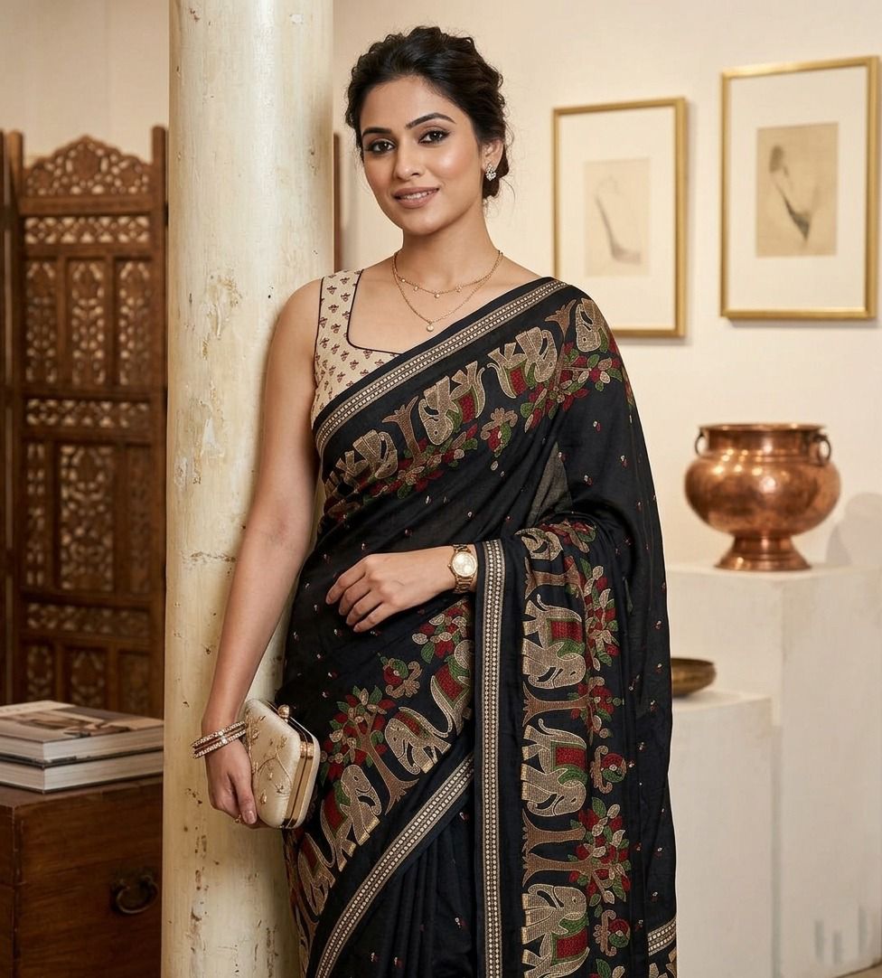 Key Features: Lightweight pure Tusser saree, vibrant Kashmiri prints that hold color wash after wash, Gadwal-style viscose border for traditional charm, and breathable comfort for Indian summers.